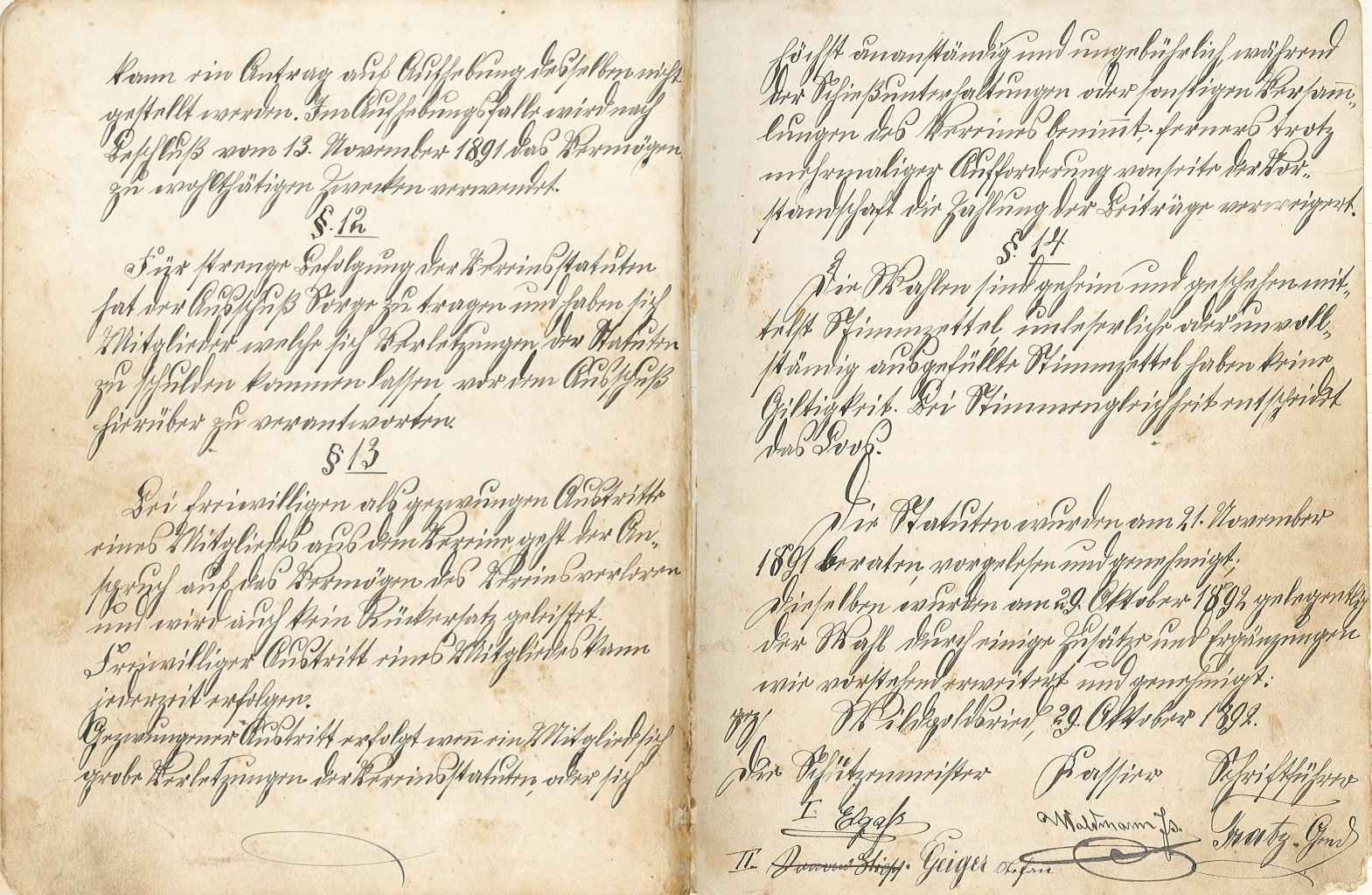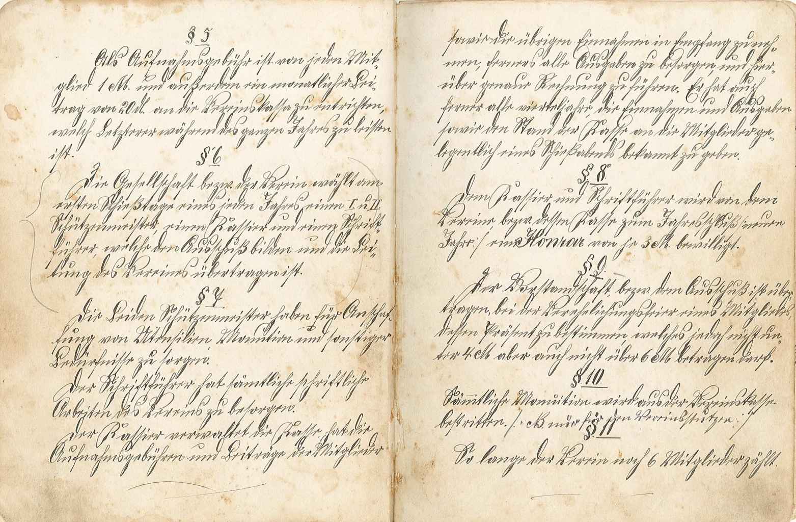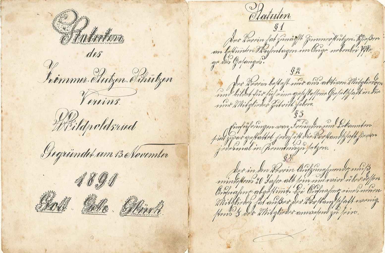 Die damaligen Statuten sind dank der mustergültigen Buchführung der Vorfahren vollständig erhalten. Im Paragraph 1 heißt es: "der Verein hat zunächst Zimmerstutzenschießen an bestimmten Tagen im Auge, nebenbei Pflege des Gesanges". Paragraph 2 besagt, daß der Verein nur aus aktiven Mitgliedern besteht und "für sich eine geschlossene Gesellschaft, zu der nur Mitglieder Zutritt haben", bildet. Einführung von Freunden und Bekannten waren zwar gestattet, doch musste die Vorstandschaft jedesmal hiervon in Kenntnis gesetzt werden. Der in den Verein aufzunehmende Schütze musste mindestens 20 Jahre alt sein.